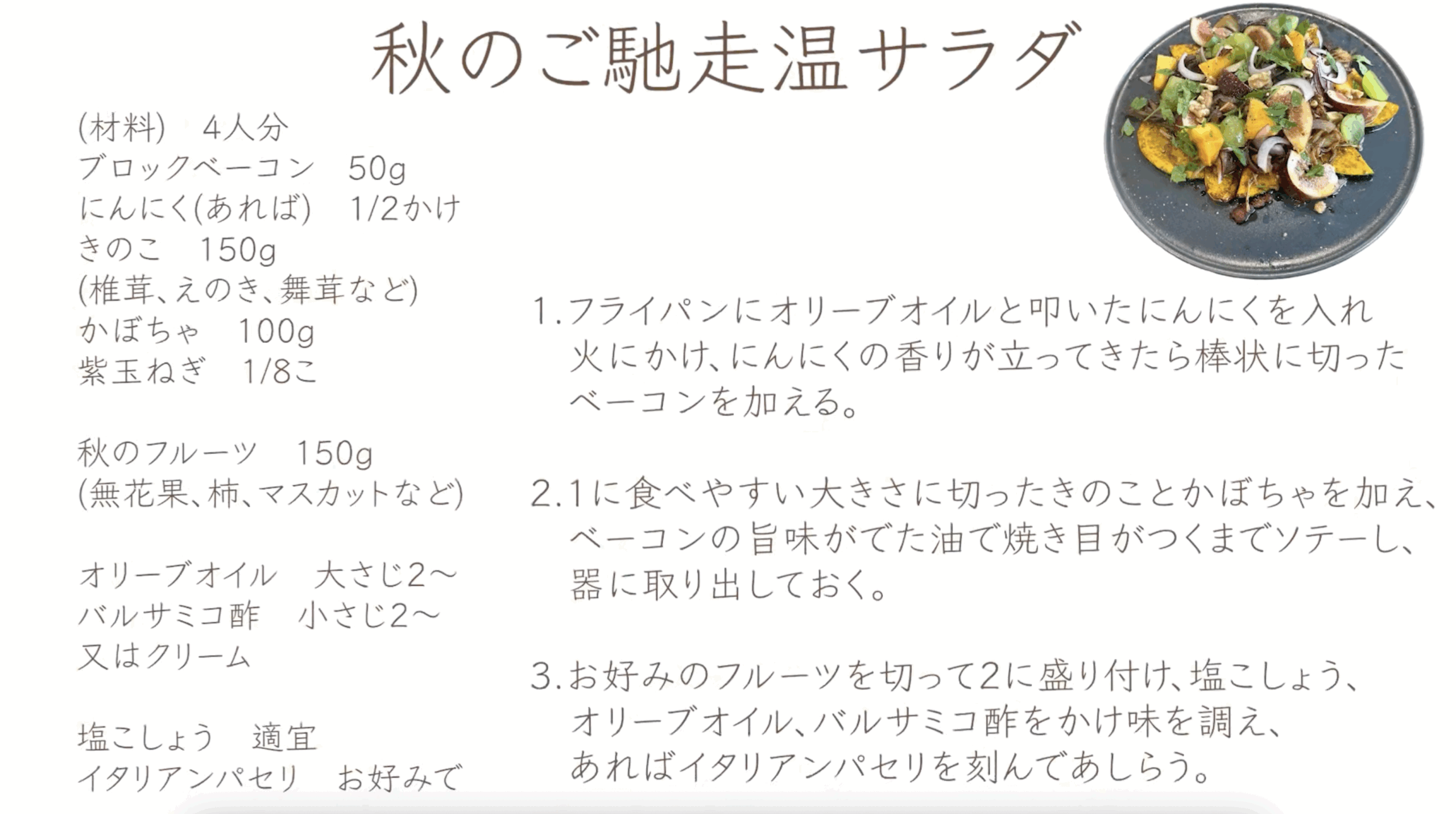 秋のご馳走温サラダ 投稿日 2025年11月28日 更新日 2025年12月1日 著者 松本 紗智 カテゴリー 無料公開 画像でダウンロード PDFでダウンロード ログイン 購入済みの方は、ログインしてください。 ログイン画面へ パスワードをお忘れですか?